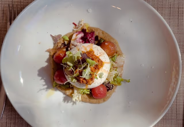 - Burrata de búfala sobre berenjena asada y pesto rosso