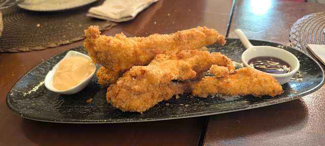- Tiras crujientes de pechugas de pollo rebozadas en panko con mayonesa kimchi
