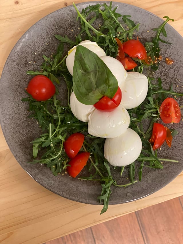 Mozzarella di bufala da 500g, servita con rucola e pomodorini