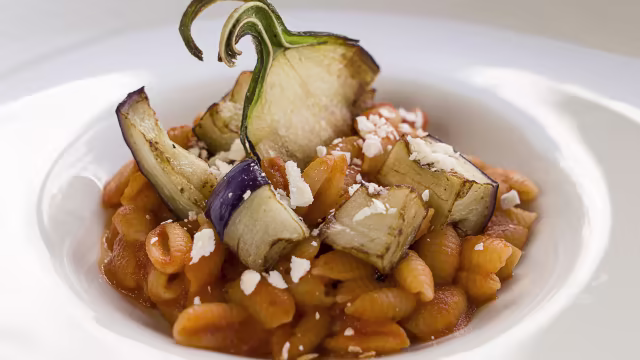- Spaghettoni di pasta fresca trafilata al bronzo con fonduta di cacio di capra girgentana, pepe nero tostato, carciofo spinoso di menfi e guanciale croccante di suino nero