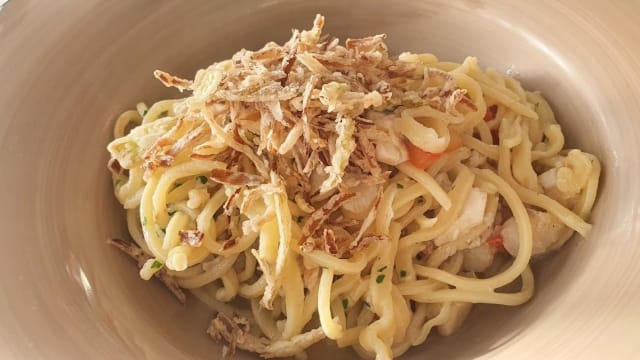 (AGLIO, OLIO, PEPERONCINO, TARTARE DI GAMBERO CON CRUMBLE DI PANE CROCCANTE)