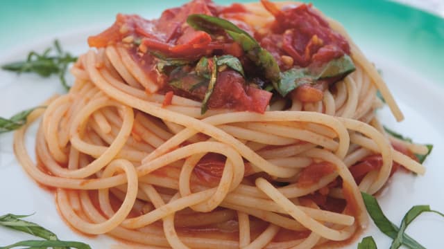 Spaghetti ai pomodori del piennolo del vesuvio e basilico