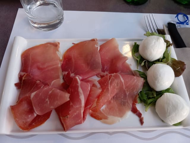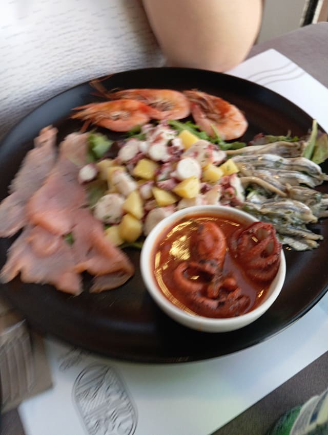 Alici marinate, salmone affumicato, gamberetti arrostiti*, polpo con patate, zuppa di moscardini