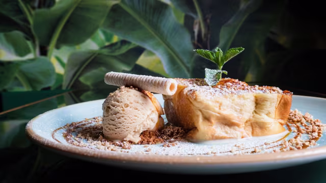 - Torrija con pan brioche caramelizada, helado de turrón de jijona y almendra crocanti