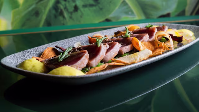 - Tataki de atún rojo frío sobre cama de alga wakame con caramelo de teriyaki y ponzu acompañado de espuma de mango.