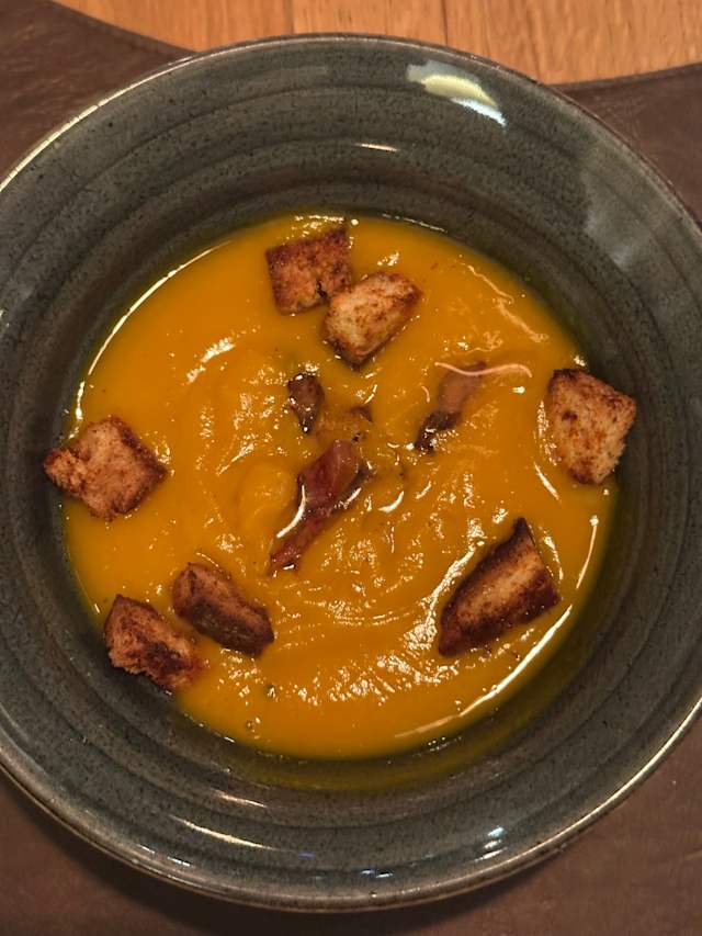 - Crema di zucca con crostini alla paprika e guancialino croccante