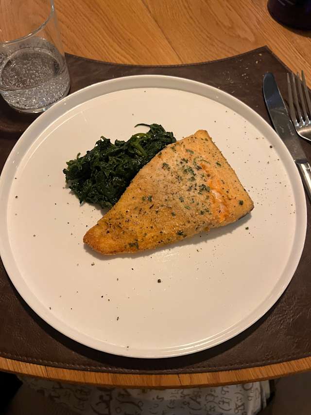 - Salmone *al forno in crosta d’erbe fini con spinacino spadellato