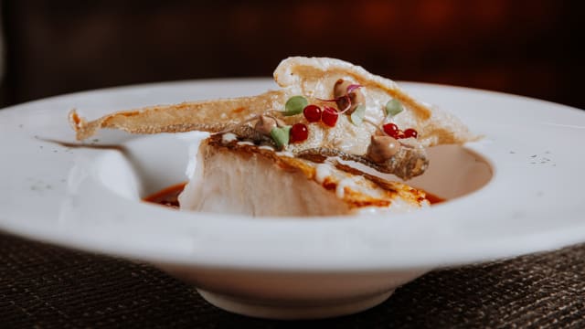 Lubina al foie, veluté de ahumado y brócoli