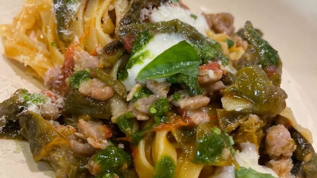 Fettuccella salsiccia e peperoncini verdi con crema di basilico