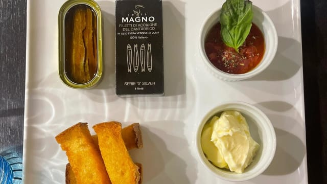 Alici del Cantabrico, crostini al burro di Normandia e pesto di pomodorini del piennolo
