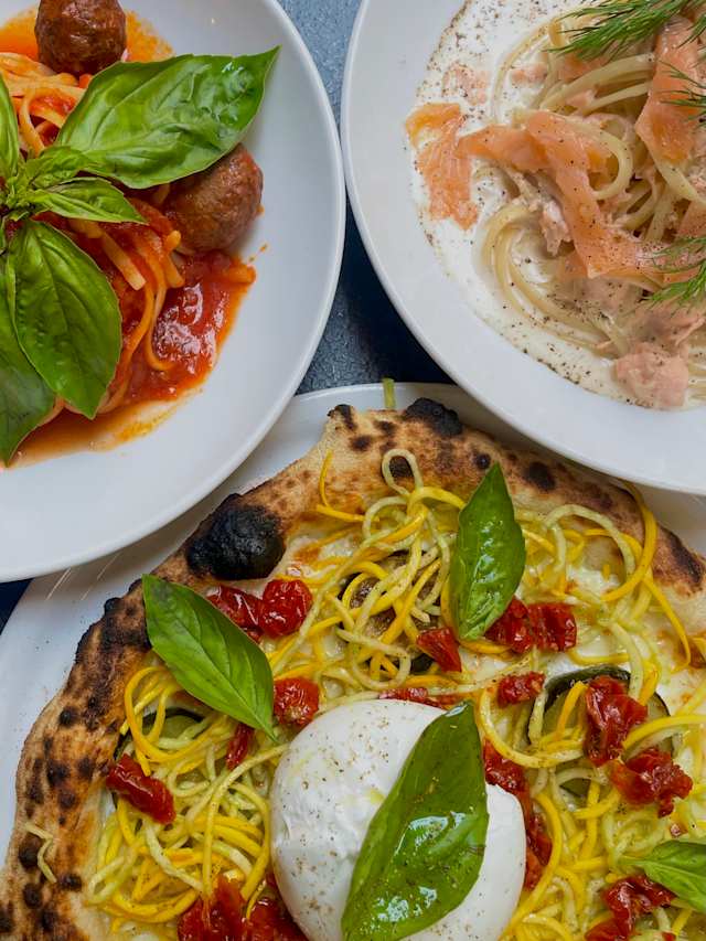 - Sauce tomate, mozzarella fior di latte, jambon, chèvre, crème balsamique