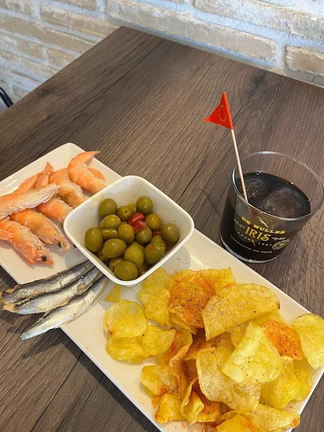 - Patatas chips, olivas, boquerones, gambas
