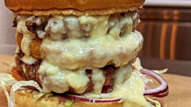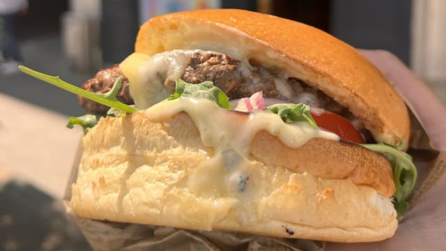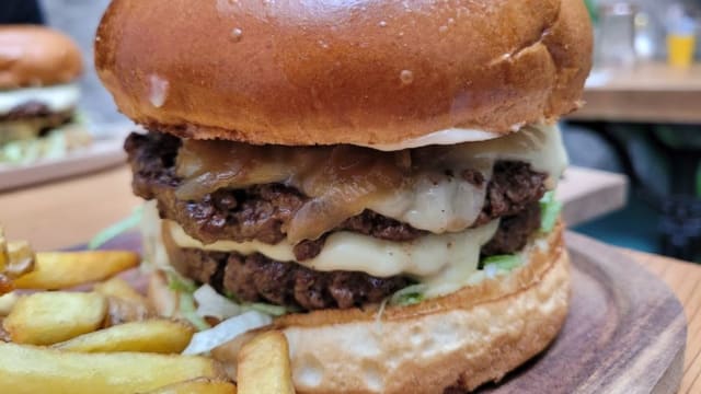 Steak de boeuf 150g, salade iceberg, sauce tonton, oignons confits, cornichons, emmental + Frites Maison + Boisson