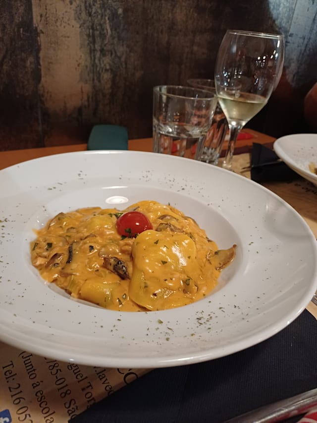 (Massa c/ camarão, lulas, molho 4 quejos e salsa)