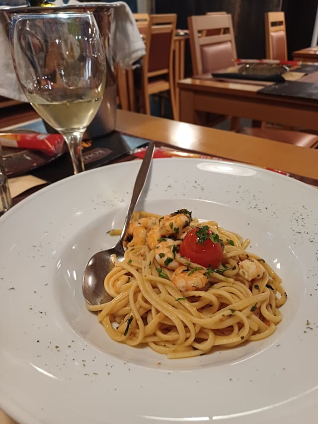 (Massa c/ camarão, mexilhão, lulas c/ molho de tomate e salsa)