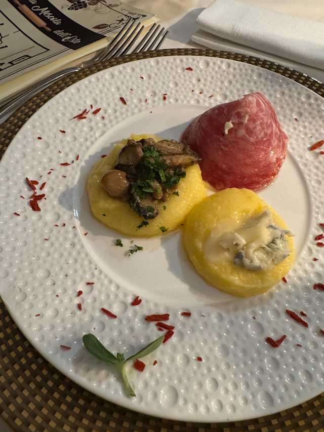 Guancialino di maialino brasato nel vino soave sul letto di funghi porcini olive tagiasche con pure e polenta