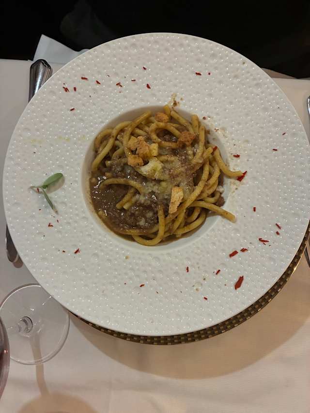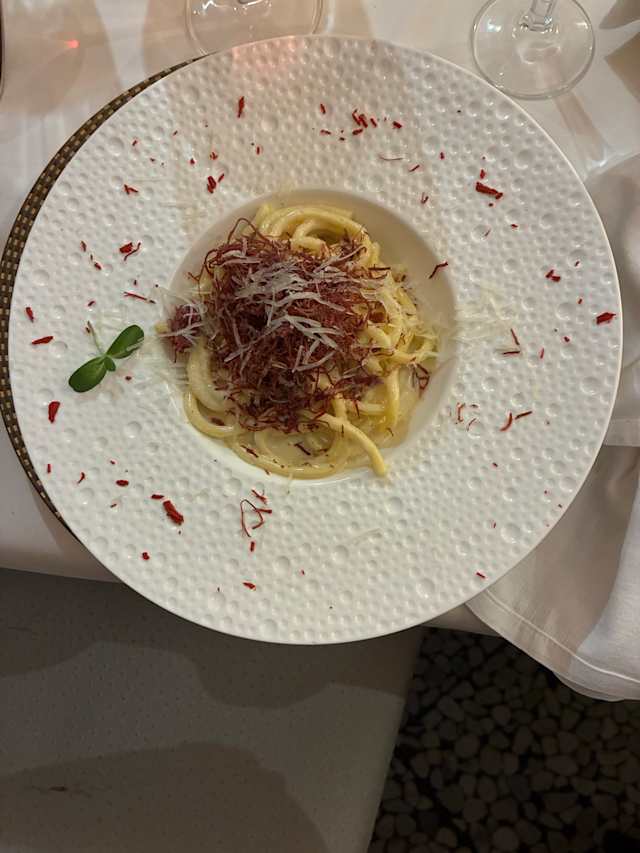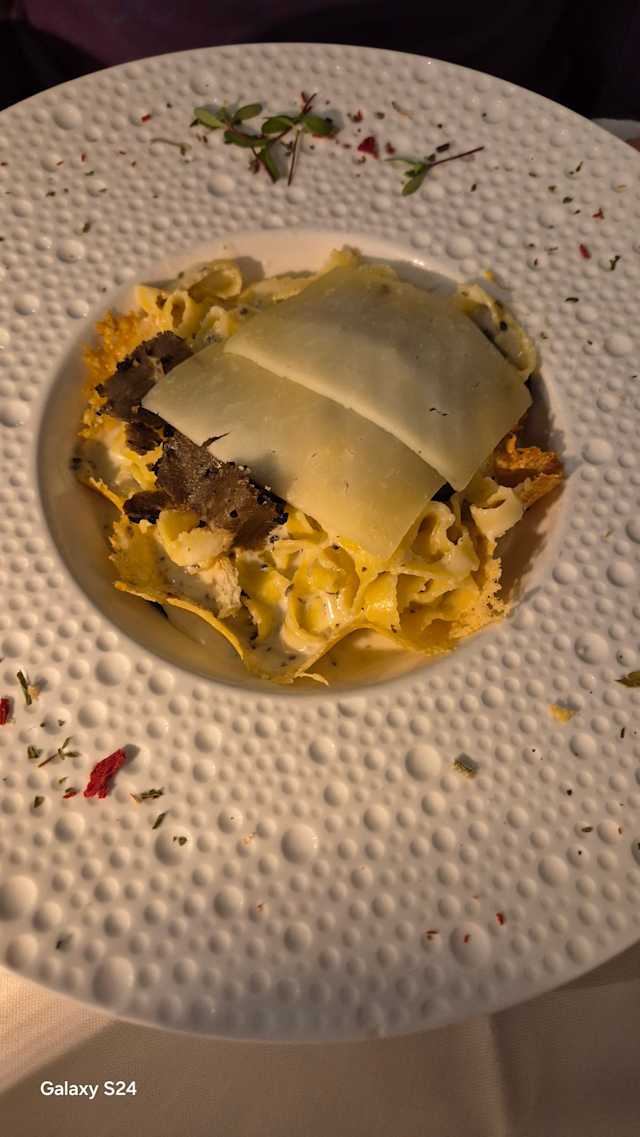 Fettuccine con tartufo in cialda di parmigiano in scaglie di formaggio bastardo