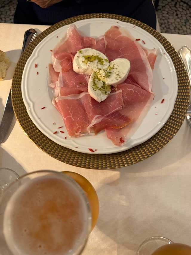 Burrata su letto di cipolla rossa di tropea caramellizzata con petto d'oca affumicato