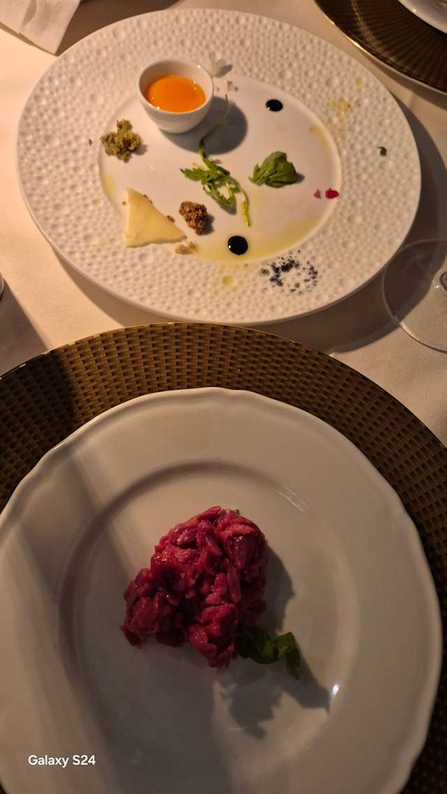 Sformatino di formaggio con radicchio rosso fonduta di monte veronese al profumo di olive tagiasche in arena di culatello di zibello
