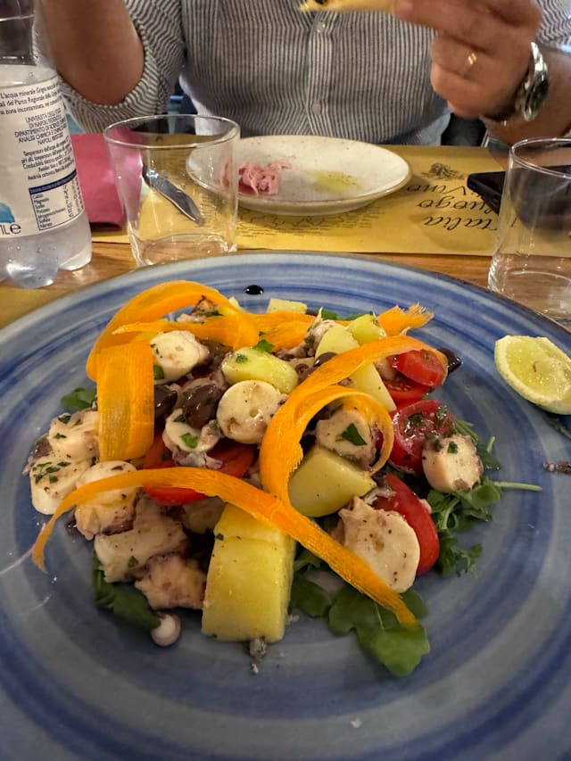 9/10The waiter was very helpful. We were a little skeptical because there weren't many people in the restaurant for lunch. One in the party had to eat gluten free and the other had a normal diet. The waiter's suggestions were delicious. The gluten free pasta and pizza bianca were delicious. The mozzarella and caponata was just right--many tend to use too much vinegar, but this was fresh and perfectly seasoned.