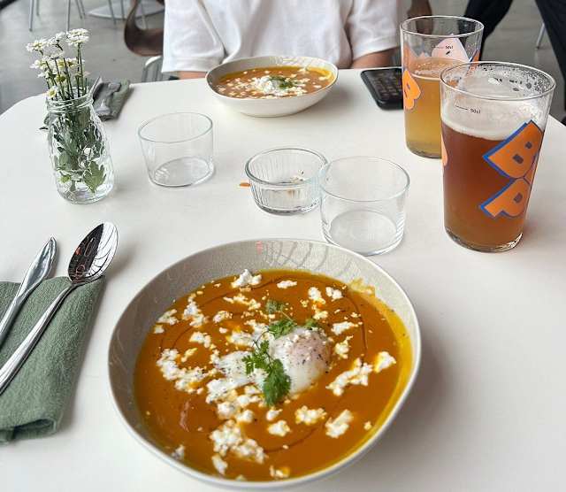 - Velouté de potimarron, oeuf parfait, feta & huile de sésame grillé