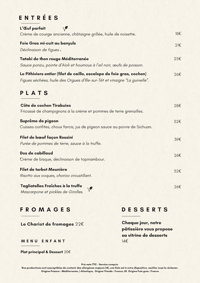 7.5/10The food as always was excellent. They have several new young staff in training and the service was not as good as it should have been - too much wine poured into the glasses and having to ask for more bread. Also our coats were not taken, so we had to put them on the back of our seats. Overall a good experience as always, but not quite as good as it should have been.
