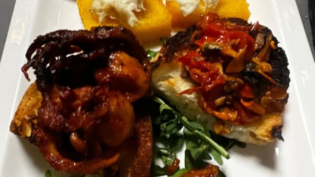 crostini di mare, scagliozzi con baccalàmantecato e cipolle caramellate, cozze e calamari ripieni