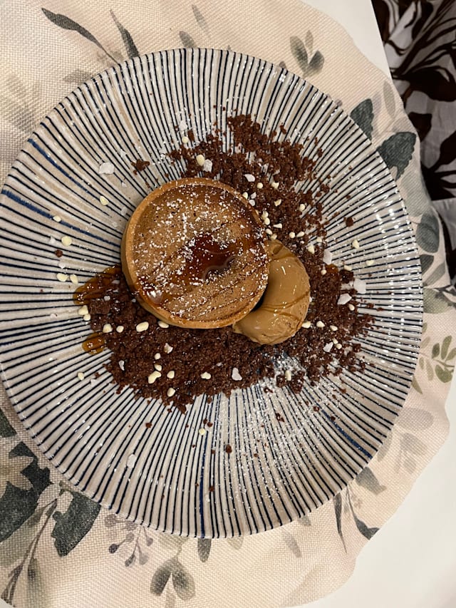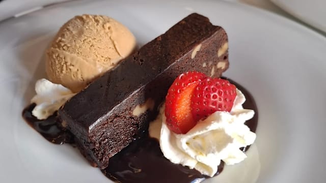 Chocolate negro, pistacho, crema inglesa de vainilla y ron especiado, helado de vainilla