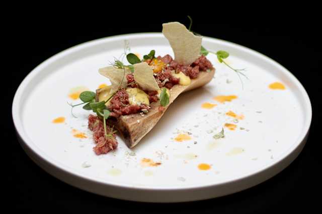 - Spaghetto “az. mancini”, ragù di angus al coltello, cialda al parmigiano e porro disidratato