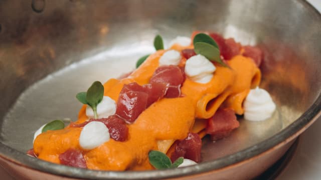 Linguine “felicetti “ mantecate con crema ai peperoni, calamaro , prezzemolo liquido e salsa teriyaki