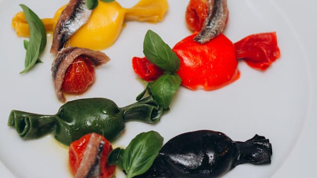 Ho sbagliato la nizzarda - ravioli ripieni al basilico, fagiolini, patate, tartare di tonno, pomodori canditi, spuma allo zabaione salato e gocce di saba