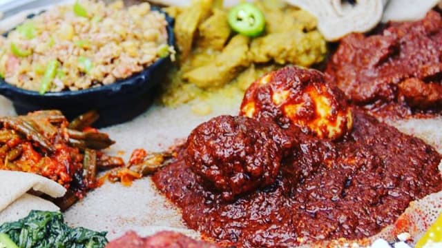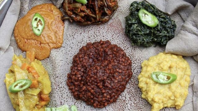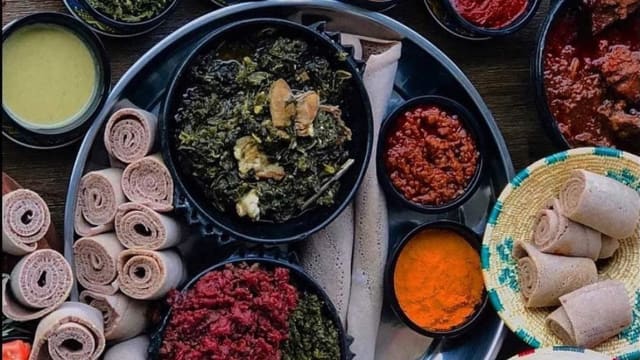 Kycklinggryta, nötköttsgryta, lammgryta, två valfria veganrätter och stek nötkött eller kitfo som serveras med keso.