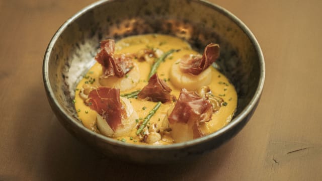 Gnocchi al nero con tinta de sepia en crema sedosa de quesos y panko, con langostinos al ajillo