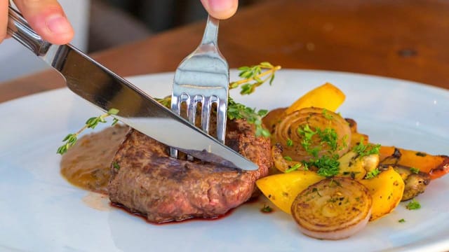 Malse 200gr kogelbiefstuk met pepersaus, friet, groente en salade