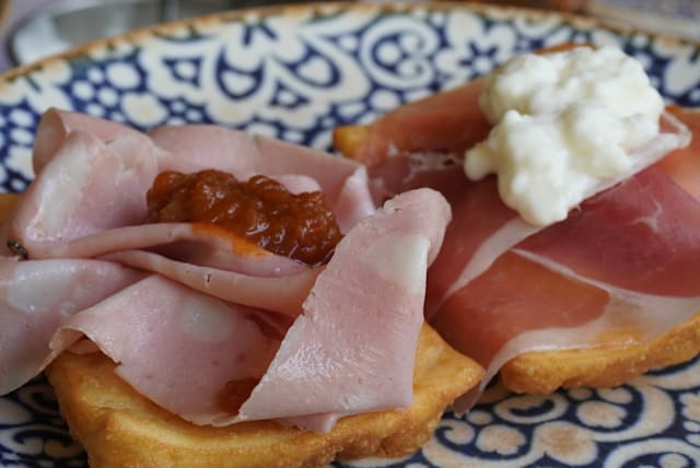 Prosciutto di parma, mortadella, coppa di testa, salame, caciotta, squacquerone, friggione, pesto montanaro, parmigiano reggiano grattugiato. / cestino con quattro tigelle e quattro crescentine