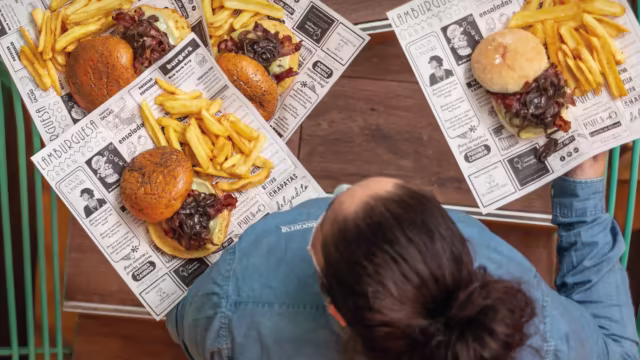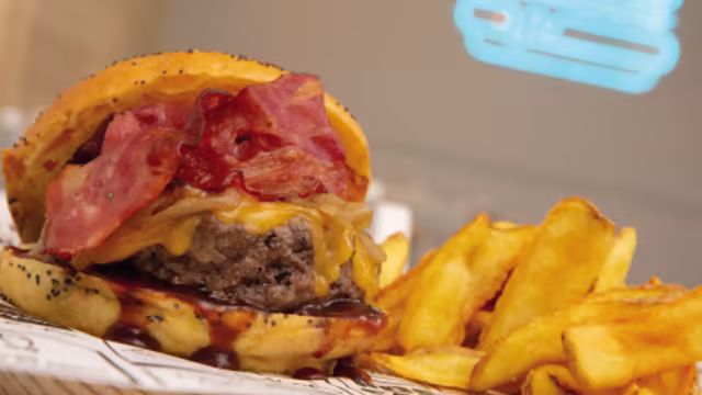 - Doble patty de 110g, doble de queso cheddar, bacon crujiente, pepinillos picados, ketchup y mostaza