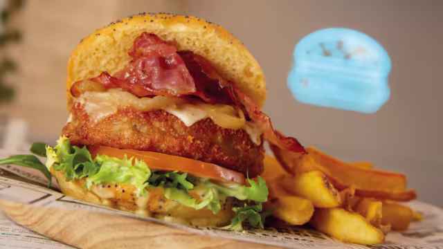 - Burger de pollo rebozada con nuestro crujiente secreto, lascas de parmesano, bacon crujiente, lechuga batavia, cebolla crispy, tomate semiseco y mayo-trufada