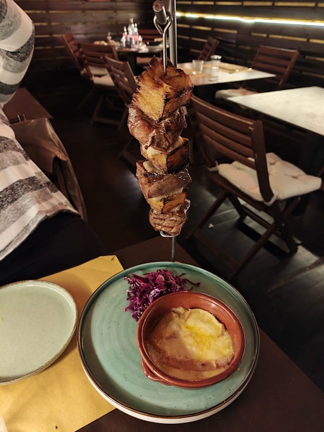Spiedone ricco di controfiletto lardellato, con patate sfogliate, cavolo viola marinato e raclette filante