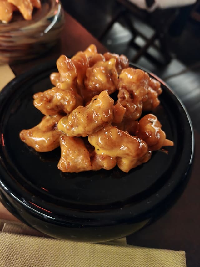Bao soffice con pollo croccante, cavolo marinato e mix di salse wasabi, teriyaki e chipotle per un morso esplosivo.