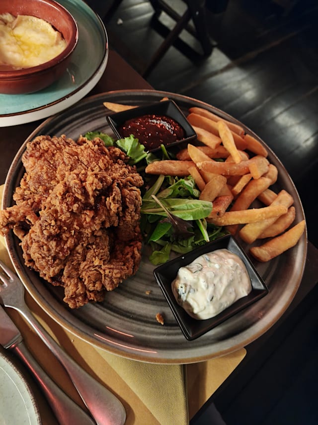 Due pezzi di pollo fritto croccante con patatine dorate, salse artigianali bbq e tzatziki