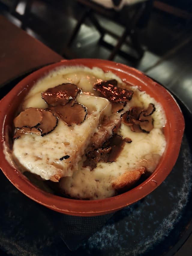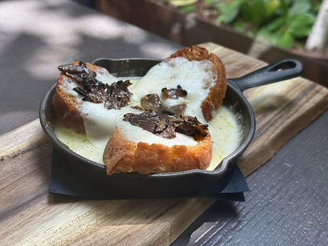 Crema calda di pecorino con miele dolce e tartufo profumato su crostino di pane toscano