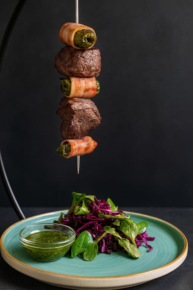 Spiedone di picanha con jalapenos ripieni di feta e avvolti nel bacon, salsa chicmichurri, accompagnato da cavolo cappuccio e valeriana fresca