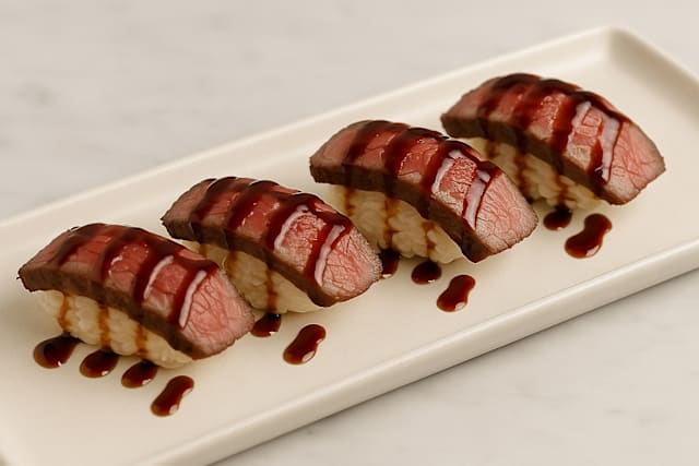 Roll di riso con tartare di manzo, avocado, coperto da tataki di diaframma e burro alle erbe flambato