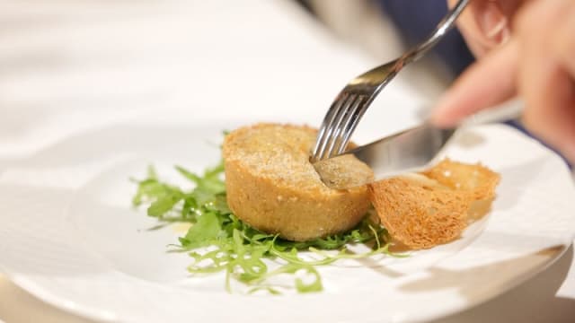 Persico gratinato con vellutata di fagiolina del trasimeno e bromoise di cetrioli e datterini