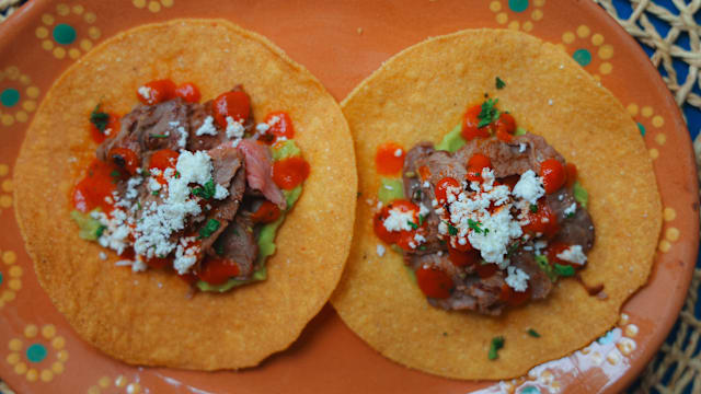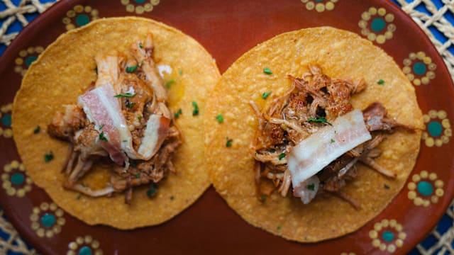 Due tortillas di mais croccanti con brisket di vitello slow-cooked, guacamole, formaggio fresco e salsa al frutto della passione