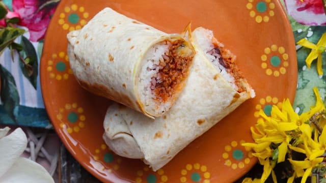 Pollo, verdure fresche, tortilla large e uno spruzzo di lime. Con pico de gallo e guacamole