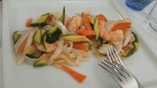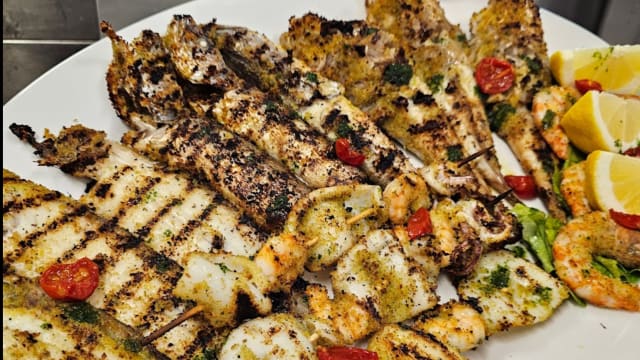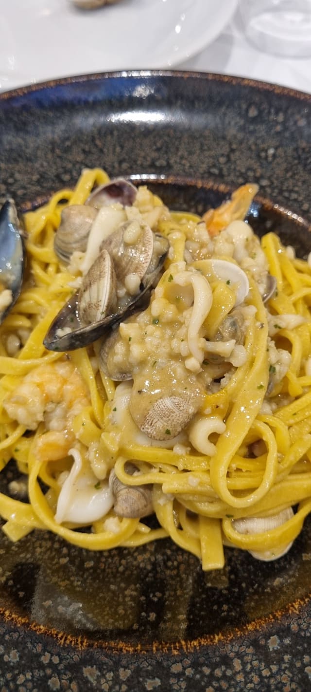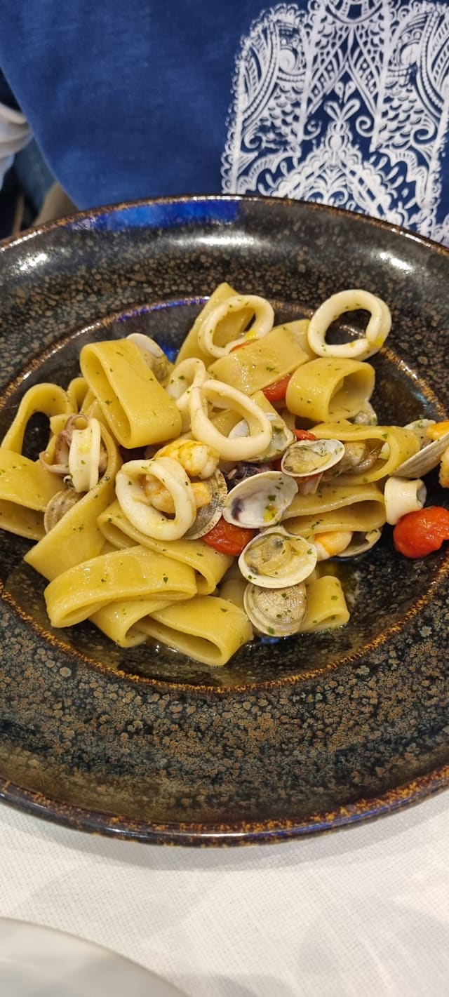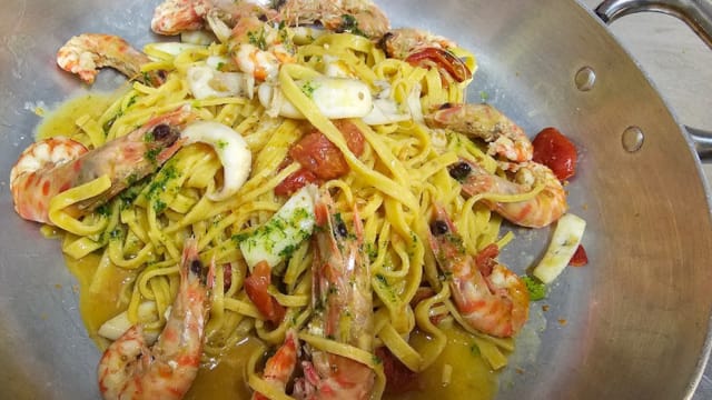 - Calamarata: calamari, gamberi, vongole e pomodorini confit al profumo di finocchietto