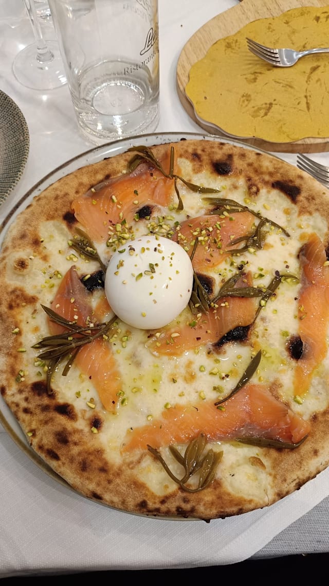 - (pomodoro, alici, burrata, basilico, pistacchio)