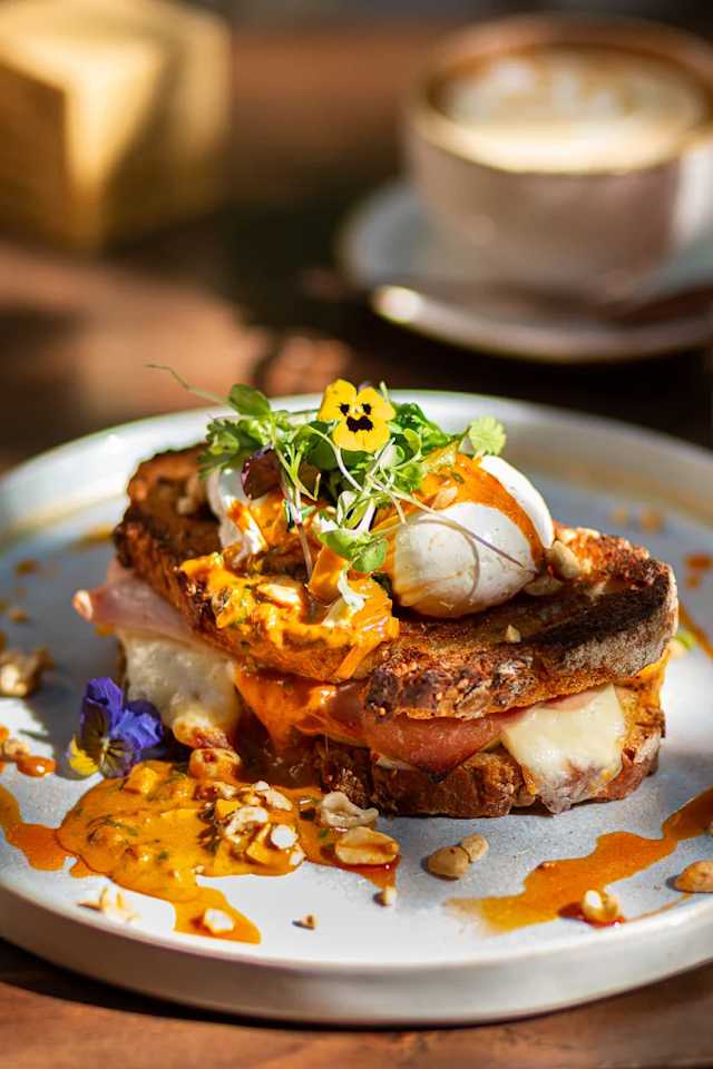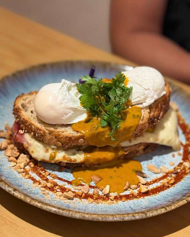 - Huevos pochados sobre bikini de masa madre relleno de queso latino, jamón y plátano asado, bañado en salsa de cacahuetes, cilantro fresco y cacahuete tostados.