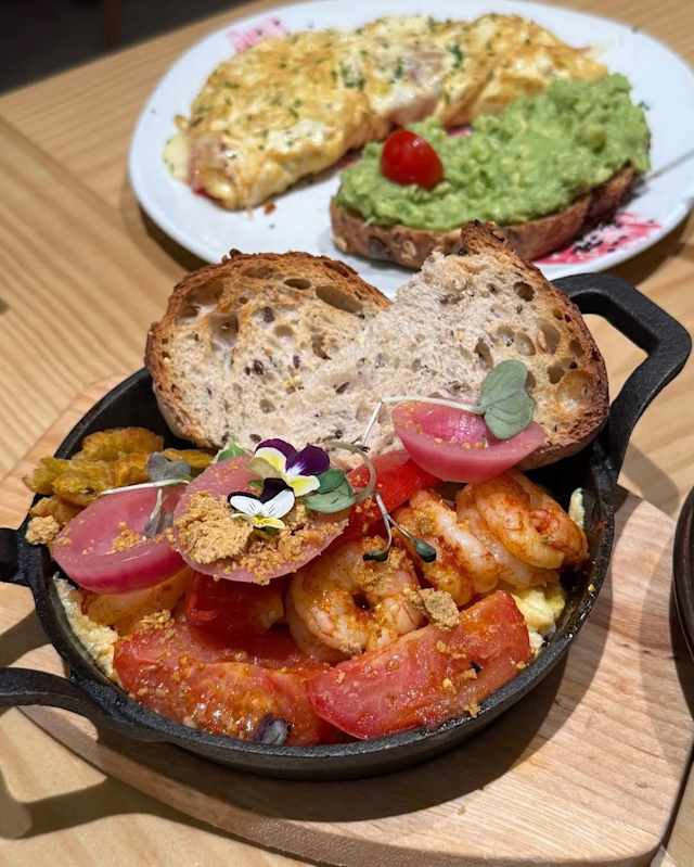 - Paila de cremosos huevos revueltos, tomate asado, gambas marinadas en achiote, cebolla encurtida roja, juliana de patacón, cilantro fresco acompañado de tostada de masa madre y sal prieta (cacahuete, cilantro, pimienta, comino, achiote, ajo, tomillo, sal).